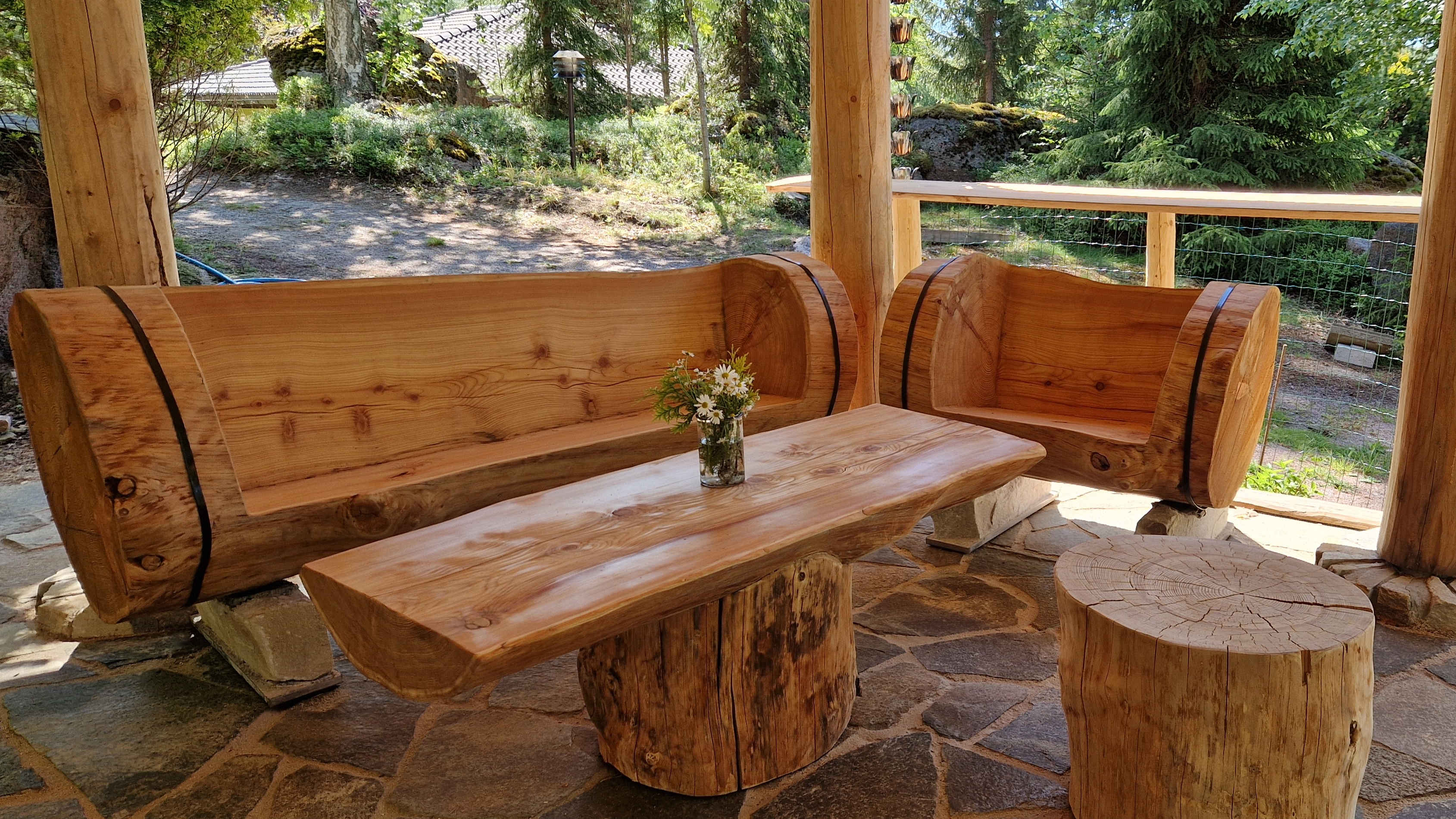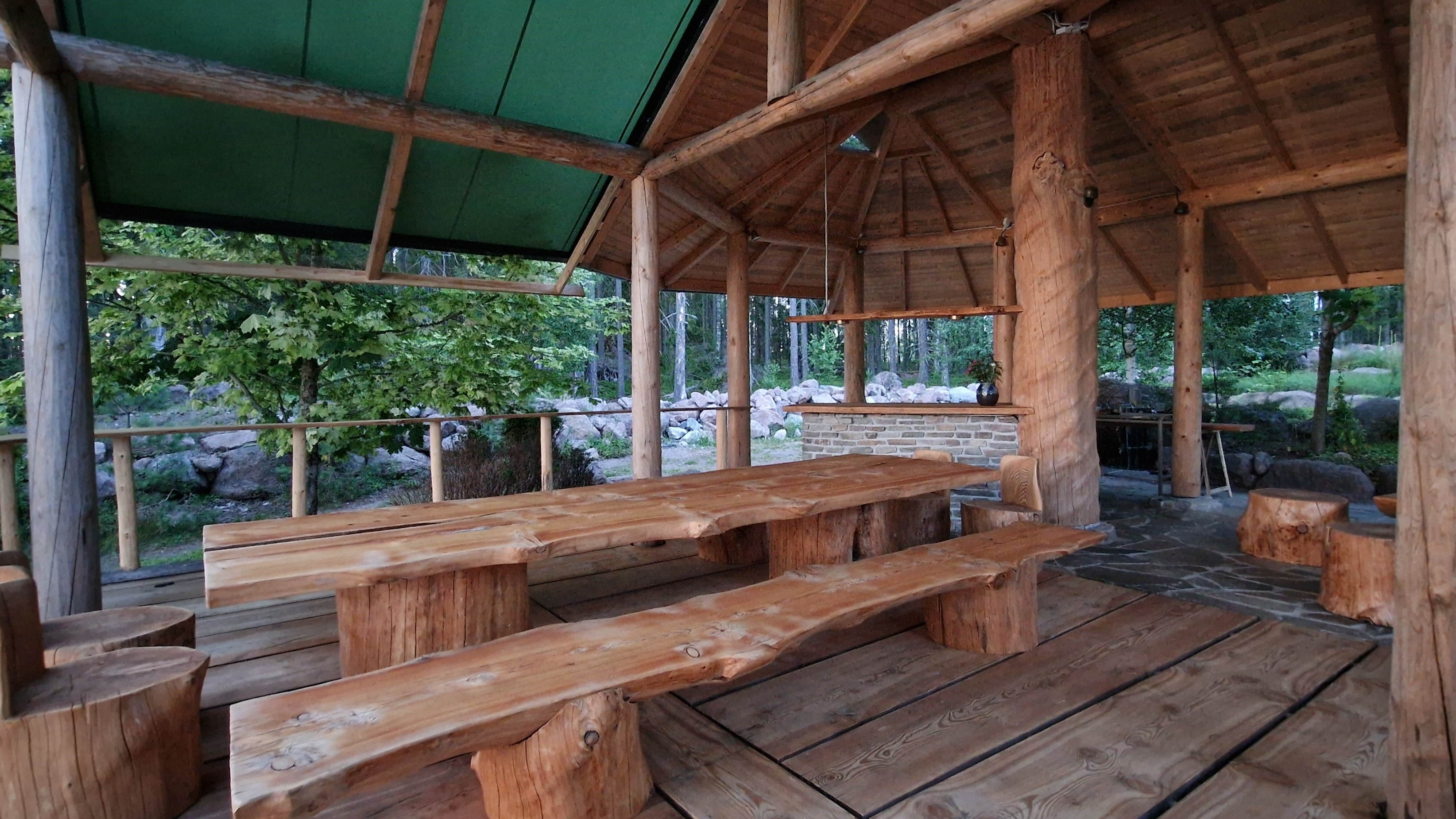 The 70m² barbeque pergolas was completed in June 2024, it is made of raw wood and embellished with stones so that the barbecue pergolas is in harmony with the surrounding nature. The large Larch wooden table together with the round table can seat 26 people, and the wooden sofa corner that can seat 6 people. The bar table, which is also made of wood and stone, makes the barbecue pergolas even more versatile.